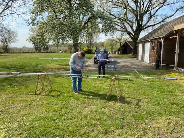 It is time to put a few things together. So with 4 people (PA3CCX (Hans)), PA0SIM (Jan)), PA3TEO (Theo)) and PE0MJX (Loek)), the dog of Hans as supervisor and Gerda, the wife of Hans as mental support, we have started to put a few parts together,.........look for the pictures,.....