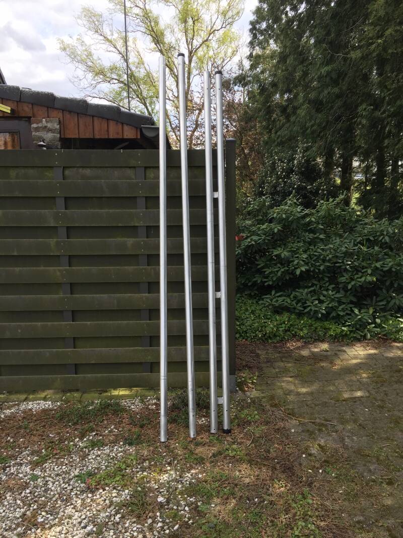 The main boom consists of three parts. One part is the middle section and this is enforced by a parallel boom. The other two parts are connected to the middle section by screwing it together with two screws. They don't have to make electrical contact, but should be fixed very tightly to prevent turning around their axes. All the radiating elements should be horizontal of course.
